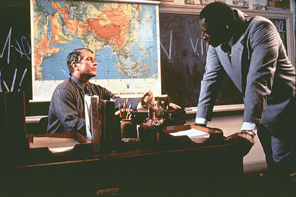 | Dir. Robert Mandel - viewed 5-21-04 on dvd (probably fourth full viewing) Grade 52 1996 The silly badass-teacher-cleans-up-school subgenre has always gotten a bad wrap, but for some reason I am often quite fond of them. The Substitute would probably make one hell of a double feature with The Principal, although it might be one that only I would enjoy with any enthusiasm. This was my first viewing of The Substitute in a few years and I was surprised by how much I still enjoyed it, even though it isn’t particularly accomplished cinematically (and is sometimes downright sloppy) or smart at avoiding clichés and genre expectations. What it does very well is set up a general air of silliness and wry humor, while sometimes slipping a scene of poignancy – although mostly thanks the performances from Berenger and Venora. I also don’t think it is particularly inappropriate to find The Substitute as a conservative white-male piece of wish-fulfillment, in much the way Joel Schumacher’s Falling Down was three years earlier. The film paints high schools as a war zone and suggests that the ideal teacher of troubled kids in the inner cities are mercenaries. It also builds up an antagonistic black principal (well played by Ernie Hudson) who seems to be the film’s critique of liberalism: concerned more with displaying his power indirectly (he breaks a paddle each year, but criticizes Berenger’s Smith for his self-defense assault on a student) and establishing liberal programs (daycare for students with children) but finally reveals him to be only interested in self-achievements – both financial gains through drug-deals and eventual political aspirations. None of which is necessarily a demerit to the film, but interesting to note in terms of changing tides of media representation in the last ten years. Also the idea of relying so heavily upon mercenaries to do our bidding instead of public officials more relevant in this era of “independent military contractors” being relied upon heavily in the current Iraq war, the commerciality of which the film comments on with one of the mercenaries showing a cheesy reel of his notable actions to a prospective buyer. |